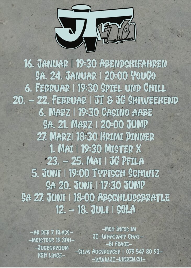 Dr Jugentreff isch für aui Teenies ab dr 7. Klass. Mir träffe üs jedä zwöit Fritiaabe im Jugendruum im KGH Linge.